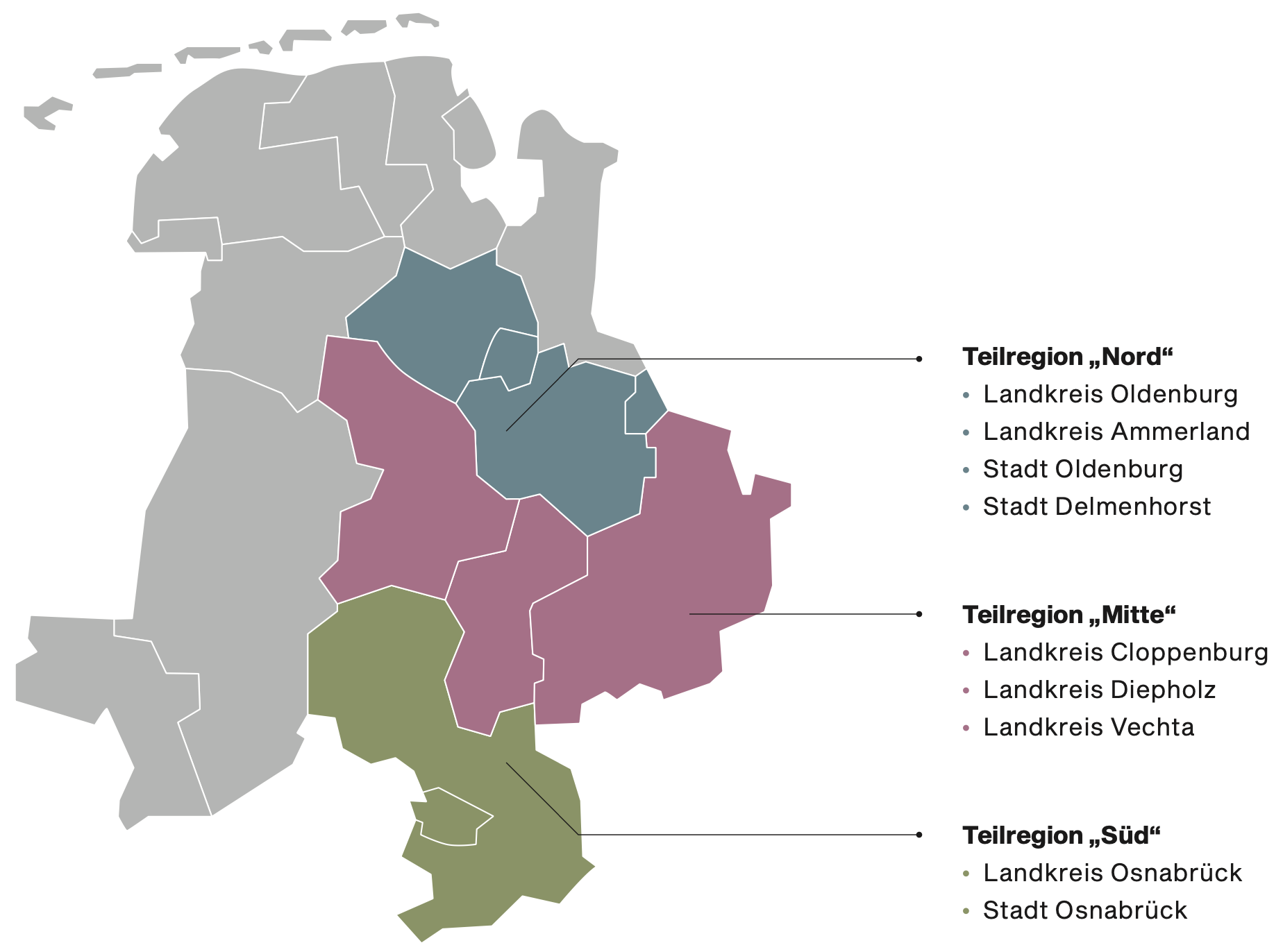 Das „Regionale Fachkräftebündnis Nordwest“ umfasst das Gebiet der Landkreise Ammerland, Cloppenburg, Diepholz, Oldenburg, Osnabrück und Vechta sowie der kreisfreien Städte Delmenhorst, Oldenburg und Osnabrück.