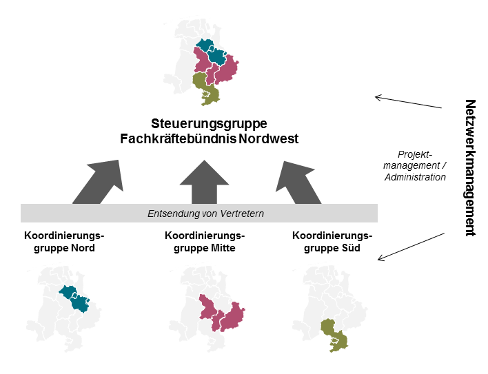 Aufgrund der Größe des regionalen Fachkräftebündnisses sowie der Vielzahl an eingebundenen Akteuren bestehen besondere Anforderungen an die Verwaltungs- und Entscheidungsstrukturen für das Fachkräftebündnis Nordwest.