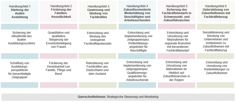 Ausgehend von der Analyse des Arbeitsmarktes und der regionalen Fachkräftesituation sowie der bestehenden Angebote und Leistungen zur Fachkräftesicherung haben die Mitglieder des Fachkräftebündnis sechs Handlungsfelder mit jeweils zwei Handlungsfeldzielen formuliert. Um die Fachkräftebasis in der Region nachhaltig zu sichern und zu verbessern, sollen sich die regionalen Aktivitäten auf diese Handlungsfelder konzentrieren.